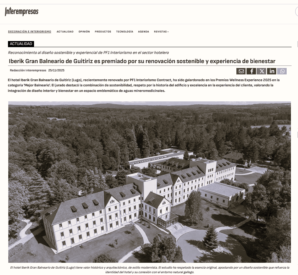 Nuestros más sinceros agradecimientos a Interempresas por contar la historia de un premio que nos emociona: el IBERIK Gran Balneario de Guitiriz, reconocido como Mejor Balneario en los Wellness Experience 2025. Detrás de cada textura, cada luz y cada estancia renovada, late el deseo de honrar un edificio lleno de memoria y transformarlo en un refugio para el bienestar.